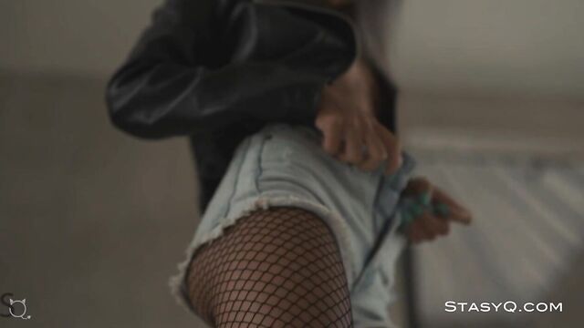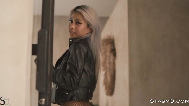 Description:RiriQ seduces the crowd with her petite figure, tanned skin, and a naughty smile that reveals her true nature. She hops into a leather jacket, black boots, and fishnet pantyhose, capturing a vibe of a rock chick. Her wild performance is eternalized by Said Energizer in a Video Release 514. This StasyQ model is proud of her fit tummy, small but firm breasts, and well-shaped booty. The fishnets hug her curves perfectly, bringing the focus to the blonde's best assets. Not only is the vixen arousing, but she is also one of a kind due to her Asian features. The leather jacket hits the floor, leaving RiriQ's breasts completely nude, at the full disposal of all fans. The bombastic cutie doesn't stop there. Once out of her boots, the coquette lays on a big bed, wearing nothing but a pair of black pantyhose. With a big smile on her lovely face, RiriQ continues to tantalize.