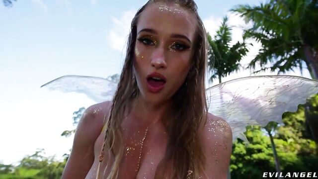 Description:This scene premieres exclusively on EvilAngel.com! Gorgeous Scarlet Chase is a forest nymph cavorting barefoot and nearly naked in a nature area -- the braided blonde beauty wears only diaphanous sprite's wings and an inserted butt plug, with gold body glitter on her face, areolae and butt. Among trees and grass, she shows her big boobs, hot ass and the wisp of pussy hair above her shaved, pierced labia. Scarlet crawls to her man Elic Chase, making eye contact with his POV camera and batting her glittering eyelashes as she gives a spit-wet blowjob with ball lapping. She impales her slit on his boner and breathes heavily, masturbating as her cheeky butt bounces and twerks. When Scarlet's flexing anus ejects the butt plug, she tastes it. They switch holes, and she takes an anal ride, her tasty rear humping and rolling. Foot fetish: Scarlet strokes Elic's erection with the soles of her feet. They alternate more intercourse, sodomy and ass-to-mouth cocksucking. Scarlet's sphincter winks. She jacks Elic's load into her mouth and rubs surplus semen into her glittering breast, smiling sweetly.