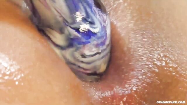 Description:This horny little brunette rubs her oiled up pussy and stuff it full of toys. Take look at the incredible skin-pore sized closeups of her pussy.