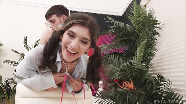 Description:Pigtailed babe Aubry Babcock smiles widely as she teases in pink shorts, blouse and a denim mini jacket. The brunette tart banters with pervy pornographer Bryan Gozzling. He shoots camera as Aubry takes on dominant stud Nade Nasty. Nade fondles Aubrey's perfect, natural tits. She sucks his cock. Nade stuffs his meat in Aubrey's furry box while she sloppily sucks on a thick pink dildo. Nade pulls Aubry's pigtails as he rails her pussy from behind. She responds submissively, giving an impressive, deepthroat blowjob. Aubry chokes, spitting and drooling down his hard shaft. Next, Nade slam-fucks her snatch doggie-style. Aubry buries her sexy tongue in Nade's butthole, giving a nasty rim job, and she licks his ball sack. She tongues his bunghole some more. Aubry masturbates as Nade jacks to an explosive climax. He spews a cum facial, his splooge splashing her forehead and nose. The delicate doll tastes the cream from her fingertips and gives Nade a respectful BJ clean-off.