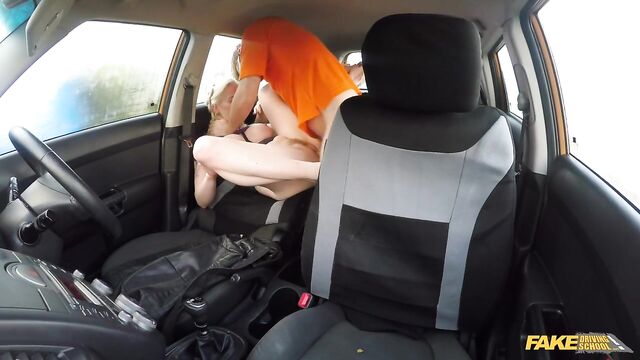 Description:Carly came to her lesson all dressed up for me! I told her there was no need to look pretty for a driving lesson, but to be honest, the sight of the busty blonde in a tight top and pencil skirt made my dick hard. I must have started touching myself, because Carly stopped her practice test to yell at me for having my cock out! I was mortified. This is it, I thought, I'm sacked for sure! Carly said to prove my dick wasn't hard by taking it out of my pants, so I did it, knowing I'd be caught. Then the cheeky blonde suggested we do something with my erection. I was a bit shocked, but more relieved. She pulled out her wonderfully massive tits and got to bobbing on my big dick right there in the front seat. The naughty bird had pierced nipples and was covered in tats, so maybe she wasn't the fairy princess I had thought. She rode my cock in the front seat right there in the parking lot, in full view of anybody, then squirted pussy juice all over the car! I wonder what my wife will say when I come home with makeup on my trousers...